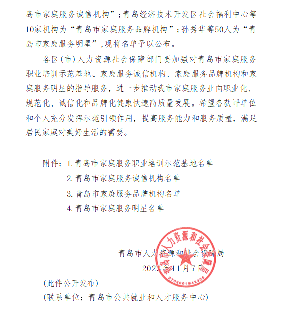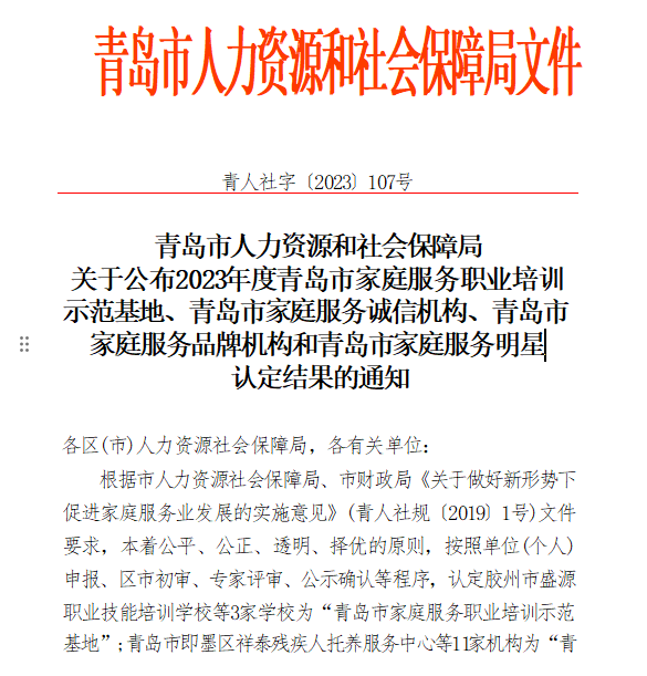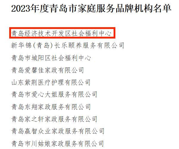 近日,青島市人力資源和社會保障局下發(fā)了關(guān)于公布2023年度青島市家庭服務(wù)職業(yè)培訓(xùn)示范基地、青島市家庭服務(wù)誠信機構(gòu)、青島市家庭服務(wù)品牌機構(gòu)和青島市家庭服務(wù)明星認(rèn)定結(jié)果的通知,經(jīng)區(qū)市初審、專家評審、公示確認(rèn)等程序,青島經(jīng)濟技術(shù)開發(fā)區(qū)社會福利中心榮獲“2023年度青島市家庭服務(wù)品牌機構(gòu)”榮譽稱號。