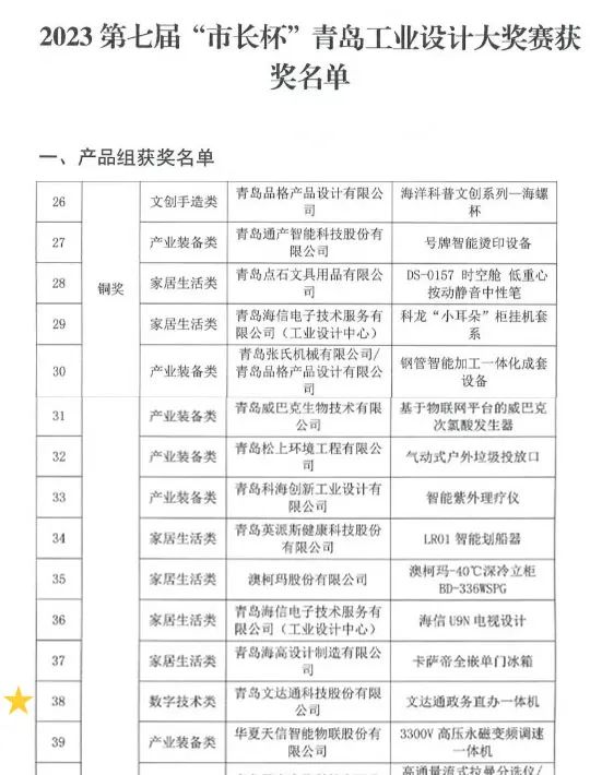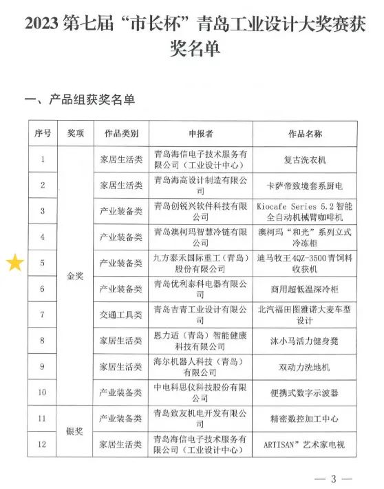 11月29日,2023年青島設(shè)計(jì)節(jié)啟動(dòng)儀式暨工業(yè)設(shè)計(jì)大會(huì)在青島國(guó)際會(huì)展中心舉行?;顒?dòng)現(xiàn)場(chǎng)公布了2023年第七屆“市長(zhǎng)杯”青島工業(yè)設(shè)計(jì)大獎(jiǎng)賽獲獎(jiǎng)名單,并舉行頒獎(jiǎng)儀式。在本次評(píng)選中,瑞源控股集團(tuán)旗下九方泰禾迪馬4QZ-3500青飼料收獲機(jī)榮獲產(chǎn)品組金獎(jiǎng)、文達(dá)通股份政務(wù)直辦一體機(jī)榮獲產(chǎn)品組銅獎(jiǎng)。