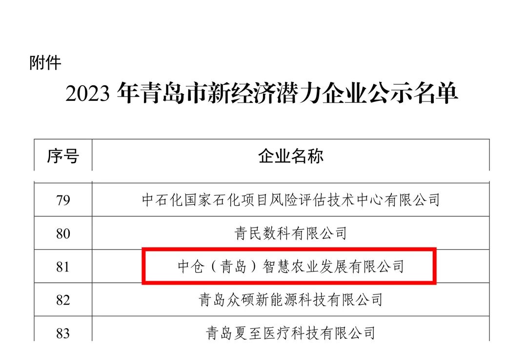 近日,2023年度青島市新經(jīng)濟(jì)潛力企業(yè)名單公布,中倉農(nóng)業(yè)榜上有名!