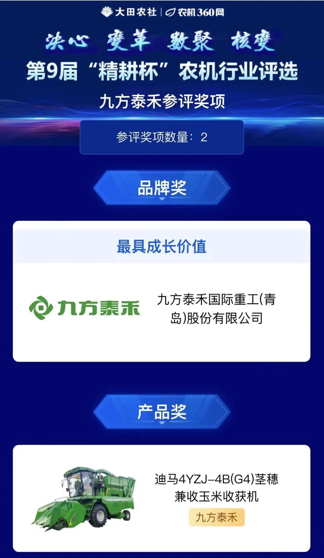 “精耕杯”創(chuàng)辦于2010年,由農(nóng)機360網(wǎng)和《中國農(nóng)機商情》共同主辦,至今已舉辦9屆,是行業(yè)最具權(quán)威性和公信力的品牌評選活動之一。獲此殊榮,是行業(yè)對九方泰禾高質(zhì)量發(fā)展取得的成績的肯定,也是對九方泰禾企業(yè)經(jīng)營能力及品牌價值的高度認(rèn)可。