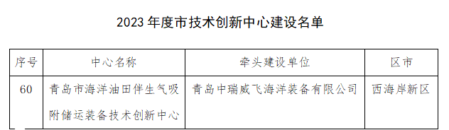近日,青島市科技局發(fā)布《關(guān)于公布2023年度青島市技術(shù)創(chuàng)新中心建設(shè)名單的通知》,確定將青島中瑞威飛海洋裝備有限公司的“青島市海洋油田伴生氣吸附儲運裝備技術(shù)創(chuàng)新中心”納入2023年度支持建設(shè)青島市技術(shù)創(chuàng)新中心。