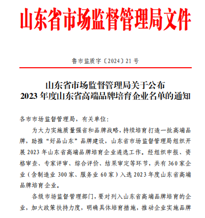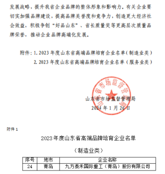 近日,山東省市場監(jiān)督管理局對2023年度山東省高端品牌培育企業(yè)名單進行公布,其中,九方泰禾國際重工(青島)股份有限公司成功入選。