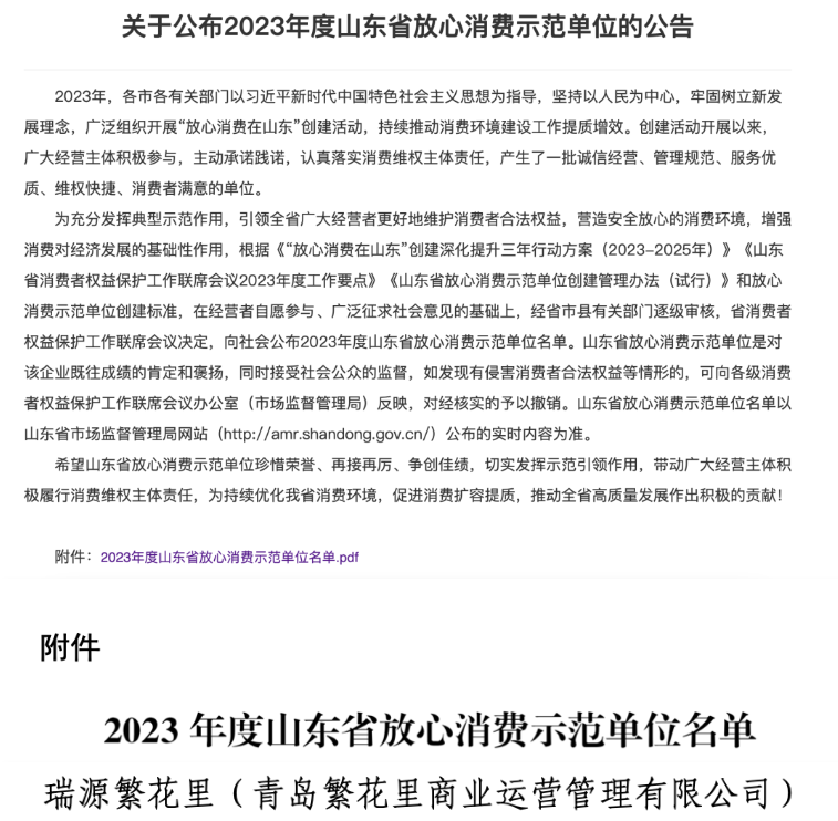 近日,山東省消費(fèi)者權(quán)益保護(hù)工作聯(lián)席會(huì)議辦公室發(fā)布《關(guān)于公布2023年度山東省放心消費(fèi)示范單位的公告》,瑞源繁花里榜上有名。