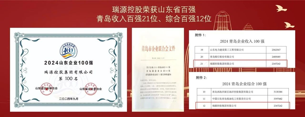 在山東省近日發(fā)布的2024省綜合百強企業(yè)名單中,瑞源控股集團榮登榜單,并于2024青島企業(yè)100強發(fā)布榜單中位列2024青島企業(yè)收入100強第21位、2024青島企業(yè)綜合100強第12位,入圍2023年度青島市社會責任示范企業(yè)名單。